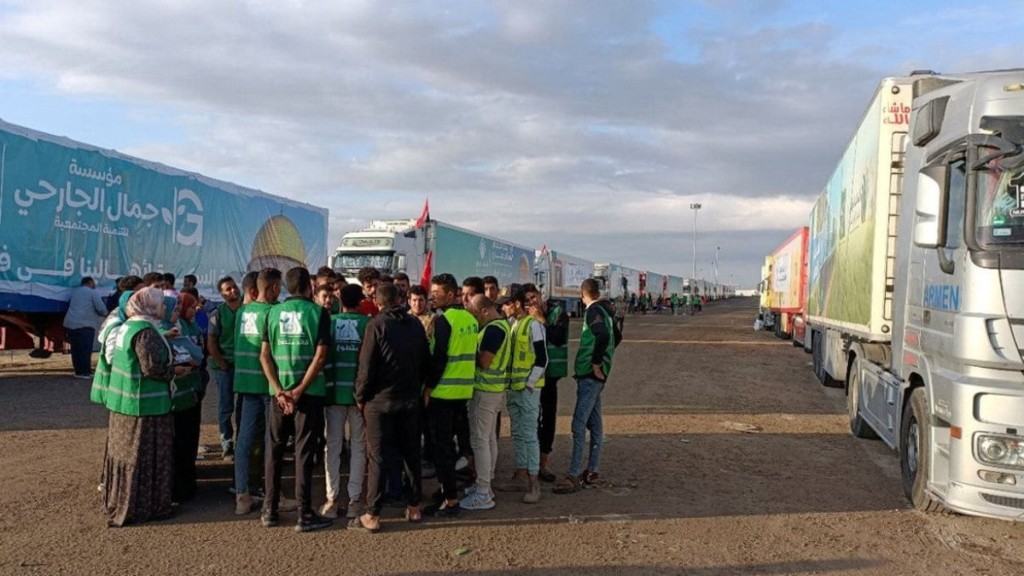 Cerca de 150 caminhões carregando medicamentos, alimentos, purificadores de água e suprimentos em geral estão parados na fronteira do Egito, aguardando autorização para entrar na Faixa de Gaza.