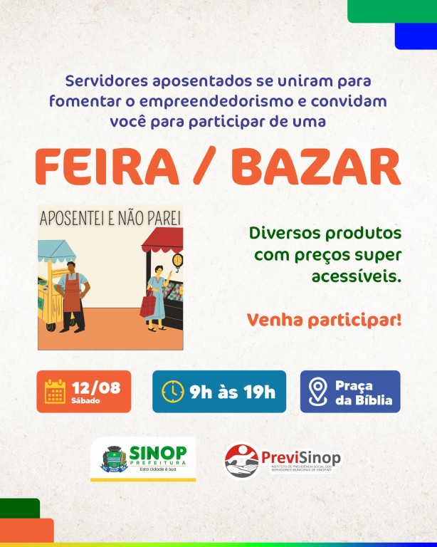 A 1ª Feira e Bazar dos aposentados, do projeto “Aposentei e não parei” será amanha (12), na praça da Bíblia. A ideia surgiu a partir da parceria entre o Instituto de Previdência Social dos Servidores Municipais de Sinop (PreviSinop) e as Secretarias de Educação, Esporte e Cultura e Secretaria de Desenvolvimento Econômico (Sedec). Essa iniciativa motivou os aposentados a se unirem para fomentar o empreendedorismo.