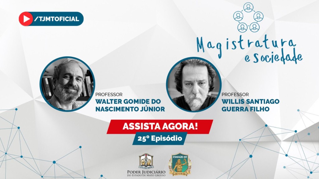 Esta matéria possui recursos de texto alternativo para promover a inclusão das pessoas com deficiência visual. Peça publicitária colorida e horizontal. Dois homens estão dispostos o primeiro usa barba, camisa xadrez e está sorrindo. Já o segundo está sério tem os cabelos pretos penteados para traz, barba branca e usa camiseta preta. Texto: Magistratura e Sociedade. Professo Walter Gomide do Nascimento Júnior. Professor Willis Santiago Guerra Filho. Assista agora. 25º episódio. A peça é assinada pelos logos do Poder Judiciário e da Esmagis.