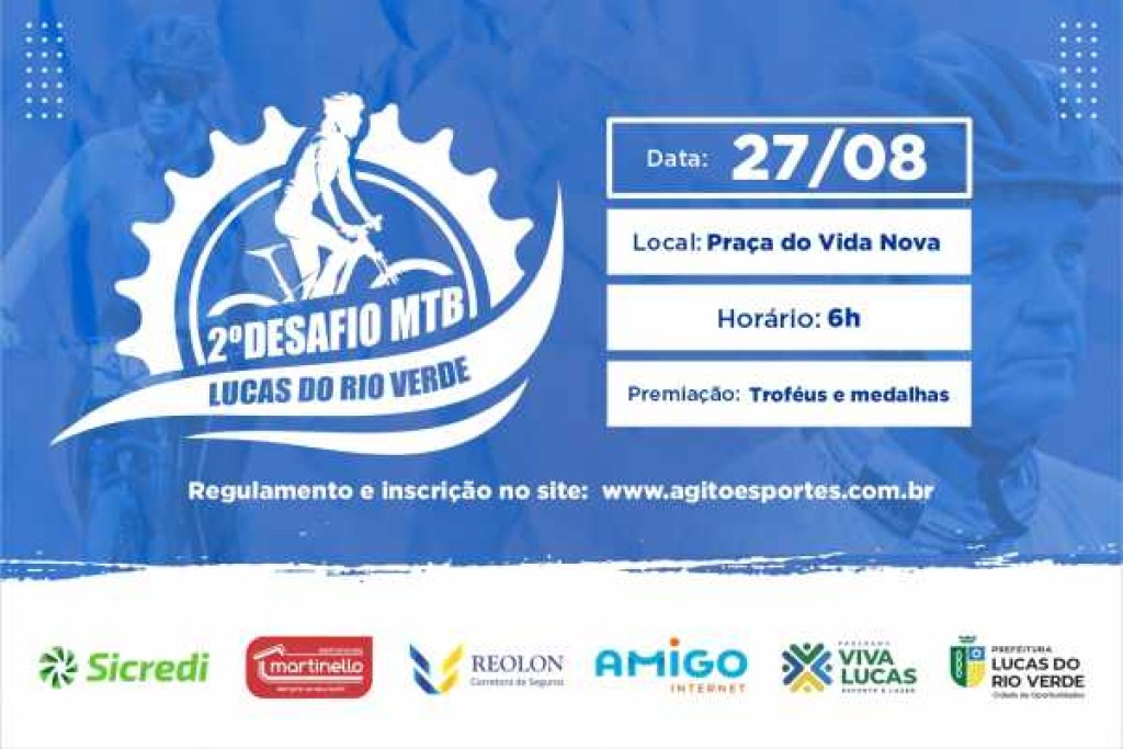 Estão abertas as inscrições para o 2º Desafio MTB, uma realização da Prefeitura de Lucas do Rio Verde, por meio da Secretaria de Esporte e Lazer. As provas serão no dia 27 de agosto nas estradas rurais do município.