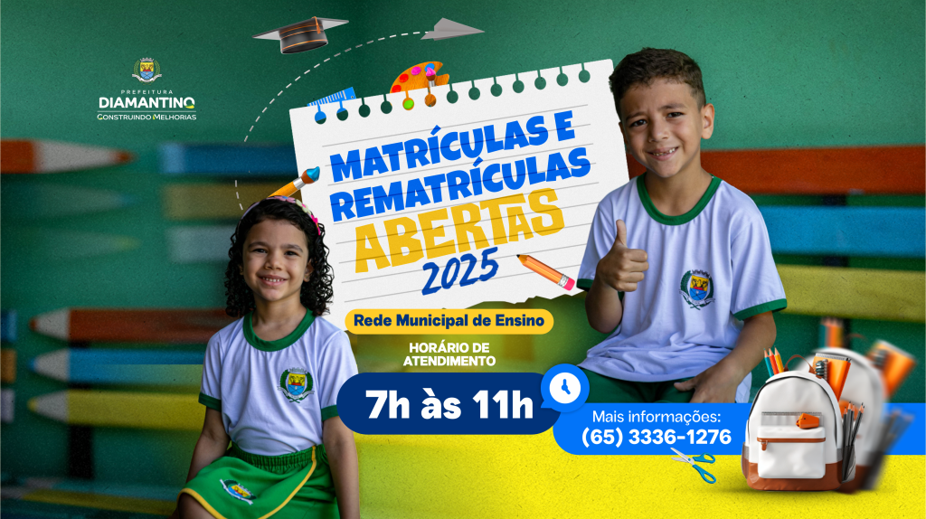 A Prefeitura de Diamantino, por meio Secretaria Municipal de Educação, convoca pais ou responsáveis que ainda não efetuaram a matrícula ou rematrícula de seus filhos para o ano letivo de 2025 a comparecerem à unidade escolar.