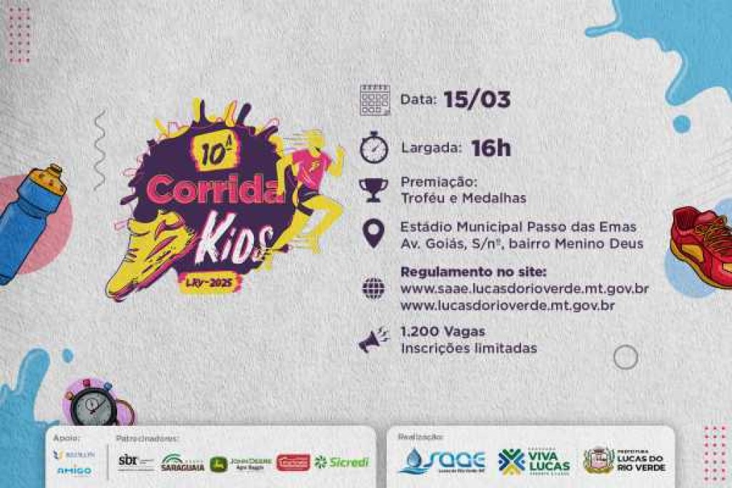 Estão abertas a partir desta terça-feira (18), as inscrições para a 10ª Corrida Kids, uma parceria entre o Serviço Autônomo de Água e Esgoto (Saae) e a Prefeitura de Lucas do Rio Verde, por meio da Secretaria de Esporte e Lazer, com apoio de patrocinadores.