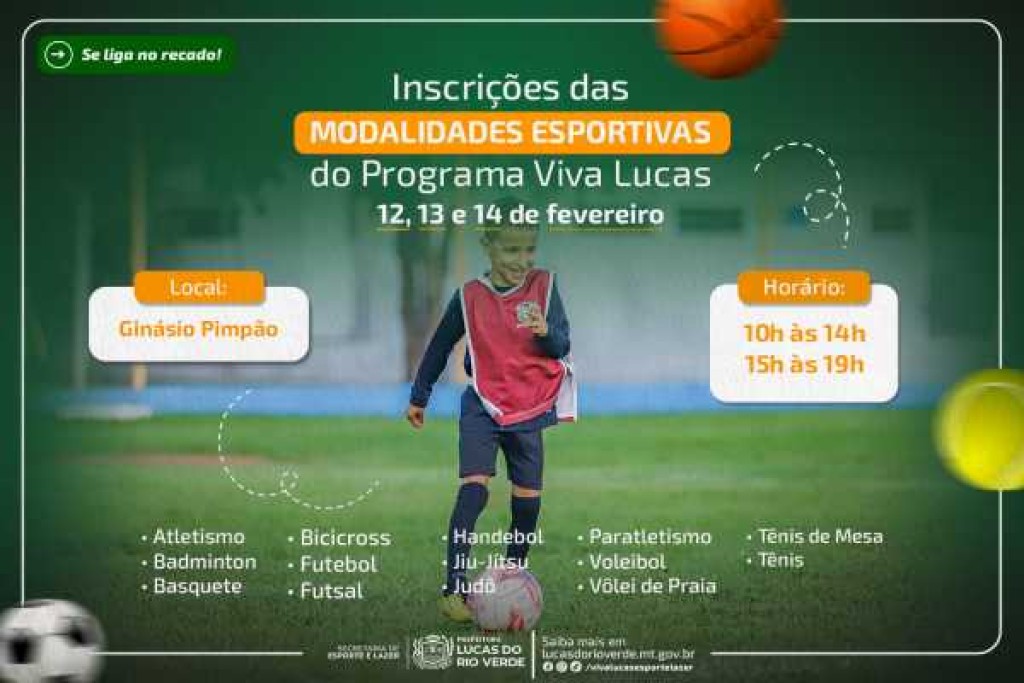 Estão abertas nos dias 12, 13 e 14 de fevereiro, as inscrições para as modalidades esportivas ofertadas pela Prefeitura de Lucas do Rio Verde, por meio da Secretaria de Esporte e Lazer.