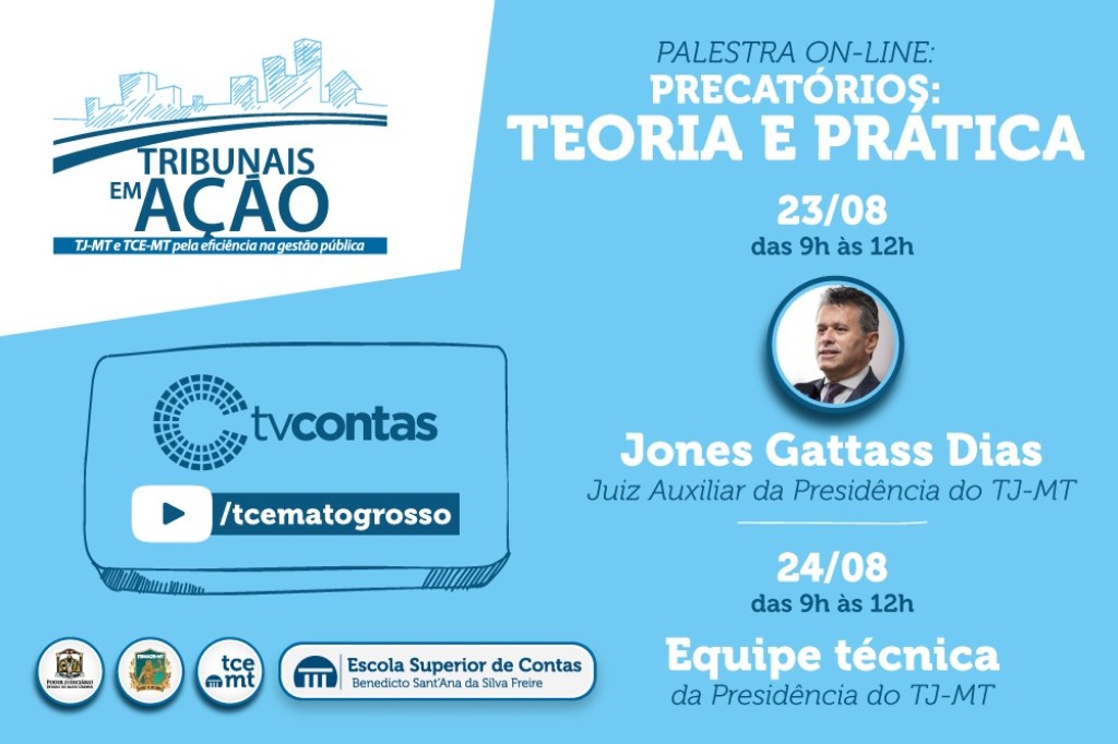 Juntos, TJMT e TCE-MT vão realizada uma palestra on-line para esclarecer administradores municipais sobre “Precatórios – Teoria e Prática”. O evento será transmitido pelo canal oficial do TCE-MT no Youtube, nos dias 23 e 24 de agosto, das 9h às 12h. As inscrições podem ser feitas AQUI até o dia 22.