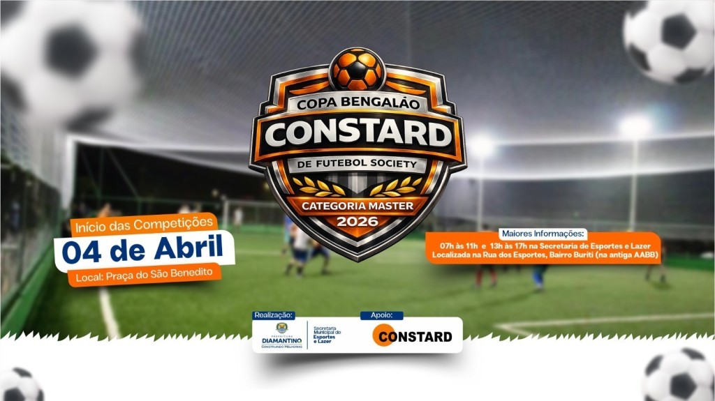 A Prefeitura de Diamantino, por meio da Secretaria Municipal de Esportes e Lazer, em parceria com a Constard Materiais de Construção, realiza neste sábado, 04 de abril, a abertura da Copa Bengalão Constard de Futebol Society. O evento acontece no campo do bairro São Benedito, a partir das 19h, com a participação de atletas nas categorias 40+ e 50+.