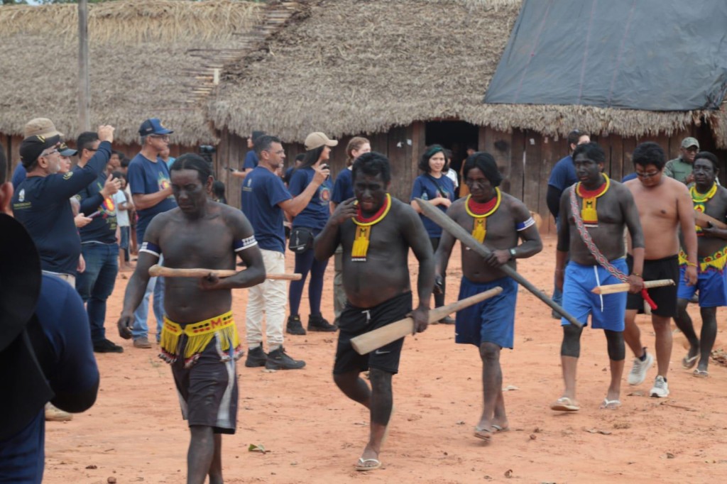 #Paratodosverem. Esta matéria possui recursos de texto alternativo para promover a inclusão das pessoas com deficiência visual. Descrição de imagem. Foto 1: Registro na apresentação cultural dos homens indígenas na aldeia. Na foto estão seis homens indígenas, todos estão com o corpo pintado e seguram um cajado de madeira na mão esquerda. Em volta deles, estão os voluntários da expedição uniformizados. Foto 2: Na imagem há um homem indígena conversando com as autoridades que acompanharam a expedição, num total de cinco homens. Eles estão no meio da oca principal da aldeia onde ocorrem as reuniões da aldeia. Foto 3: Registro do grande círculo de voluntários da expedição no centro da aldeia onde ocorreram as apresentações de boas-vindas. Na foto há aproximadamente 50 pessoas, todas de pé e uniformizadas. Foto 4: A imagem mostra a entrega de brinquedos aos pequenos indígenas que estão em fila próximos aos carros que estão carregados com os presentes. A entrega é realizada pelos voluntários da expedição que aparecem na imagem.