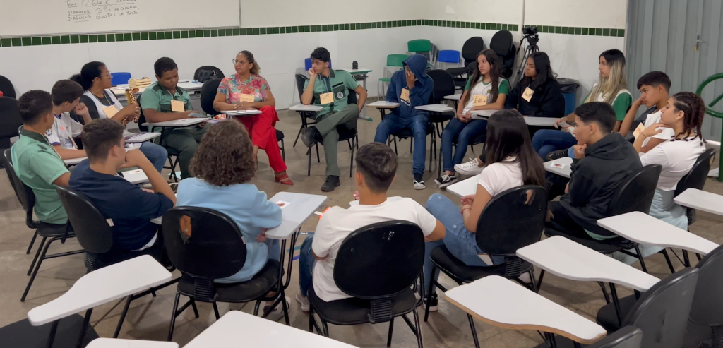 #Paratodosverem. Esta matéria possui recursos de texto alternativo para promover a inclusão das pessoas com deficiência visual. Primeira imagem: Círculo de Paz com os alunos do Nono Ano B da Escola Maria Dimpina. Segunda imagem: Facilitadora Sandra Félix concede entrevista à TV.Jus. Terceira imagem: Aluno Antônio Raphael do Nono Ano B concede entrevista. Quarta imagem: Aluna Letícia Romero também do Nono Ano B fala durante entrevista à TV.Jus.
