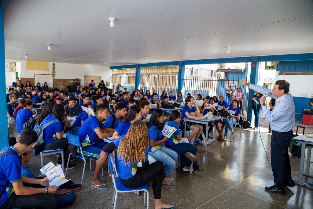 Esta matéria possui recursos de texto alternativo para promover a inclusão das pessoas com deficiência visual. Primeira imagem: Dezenas de alunos com uniforme azul da escola estão sentados, enquanto ouvem a palestra proferida pelo servidor do TJMT. Eles estão no refeitório da escola.