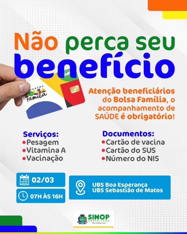 A Secretaria Municipal de Saúde (SMS) segue realizando ações de pesagem aos sábados para ofertar a população beneficiada do programa Bolsa Família do Governo Federal, um horário de atendimento diferenciado. A avaliação de saúde é um dos requisitos necessários para evitar o bloqueio do benefício.