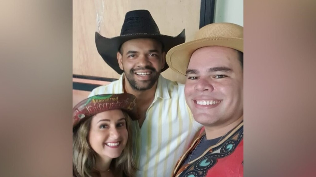 A foto de divulgação traz Amauri, Regiane e Rodrigo Silva, locutor oficial da feira de São Cristóvão.