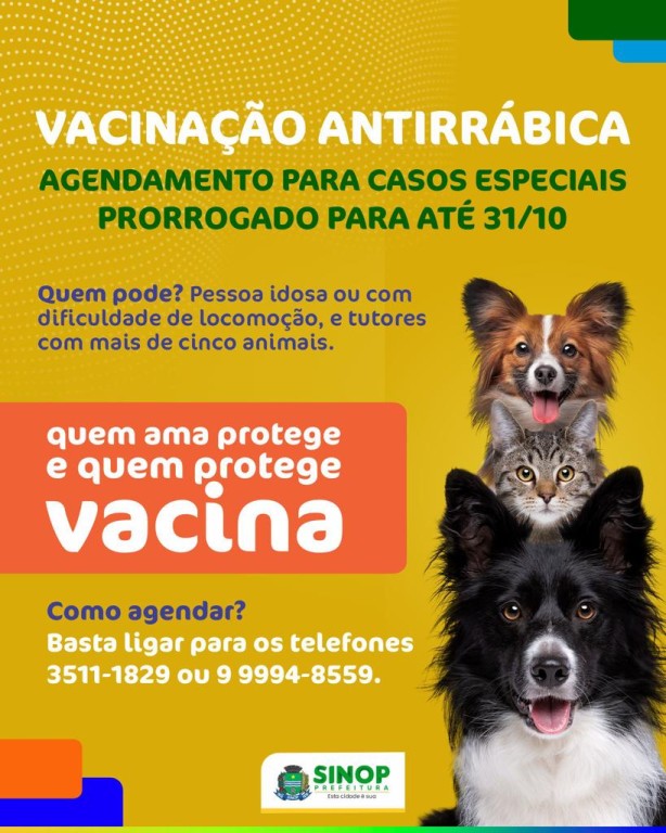 Para garantir que todos os membros da comunidade, ou seja, todo o cidadão sinopense, tenha acesso à vacinação antirrábica, o período de agendamentos para casos especiais foi estendido até a próxima terça-feira, 31, como última oportunidade para cuidar desta iniciativa tão importante para a vida saudável dos seus animais de estimação. Essa extensão visa acomodar pessoas idosas e aqueles que enfrentam desafios de locomoção, bem como proprietários de mais de cinco animais.