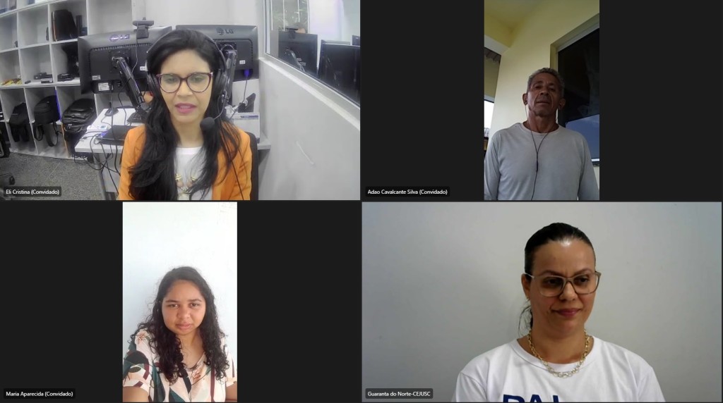 #Paratodosverem – Esta matéria possui recursos de texto alternativo para promover a inclusão das pessoas com deficiência visual. Descrição de imagens: Foto 1: Captura de tela da audiência. No canto ao lado esquerdo a jovem Ana Paula, a sua direita a gestora do Cejusc, Patrícia Elaine, e na tela em cima, o pai da jovem, Adão Silva.