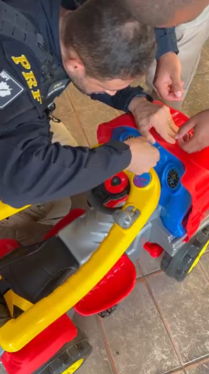 A pessoa que havia despachado a encomenda estava indo para o mesmo destino, causando estranheza. Após uma verificação mais detalhada, ficou claro que o peso da bagagem não correspondia ao de um simples brinquedo. A equipe procedeu à abertura da bagagem e encontrou dois tabletes de cloridrato de cocaína, totalizando aproximadamente 2,2 kg.