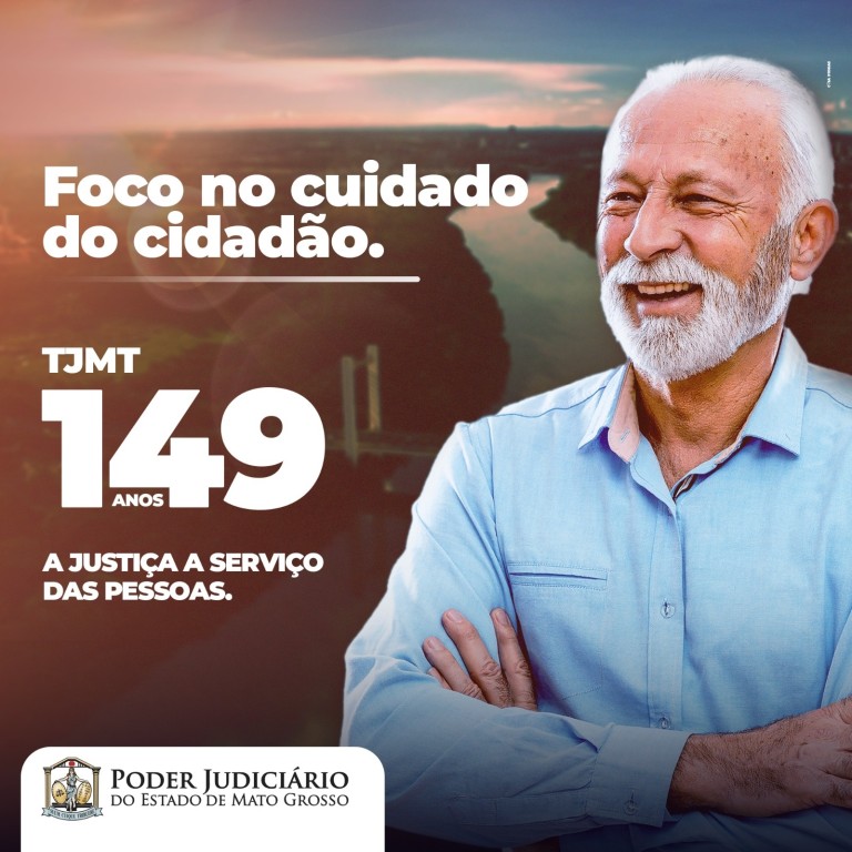 Esta matéria possui recursos de texto alternativo para promover a inclusão das pessoas com deficiência visual. Primeira imagem: arte colorida em formato quadrado. A imagem retrata um senhor idoso, sorrindo. Ele está com os braços cruzados. Ao fundo imagem de Cuiabá, mostrando o rio e a ponte Sergio Mora. Na parte superior esquerda a frase: Foco no Cuidado do Cidadão. Logo a baixo outra frase: TJMT 149 anos. A Justiça a Serviço das Pessoas. Segunda imagem: fotografia colorida mostrando um ônibus do transporte público municipal circulando pela cidade. No para-brisa traseiro um busdoor com a campanha dos 149 anos do TJMT.