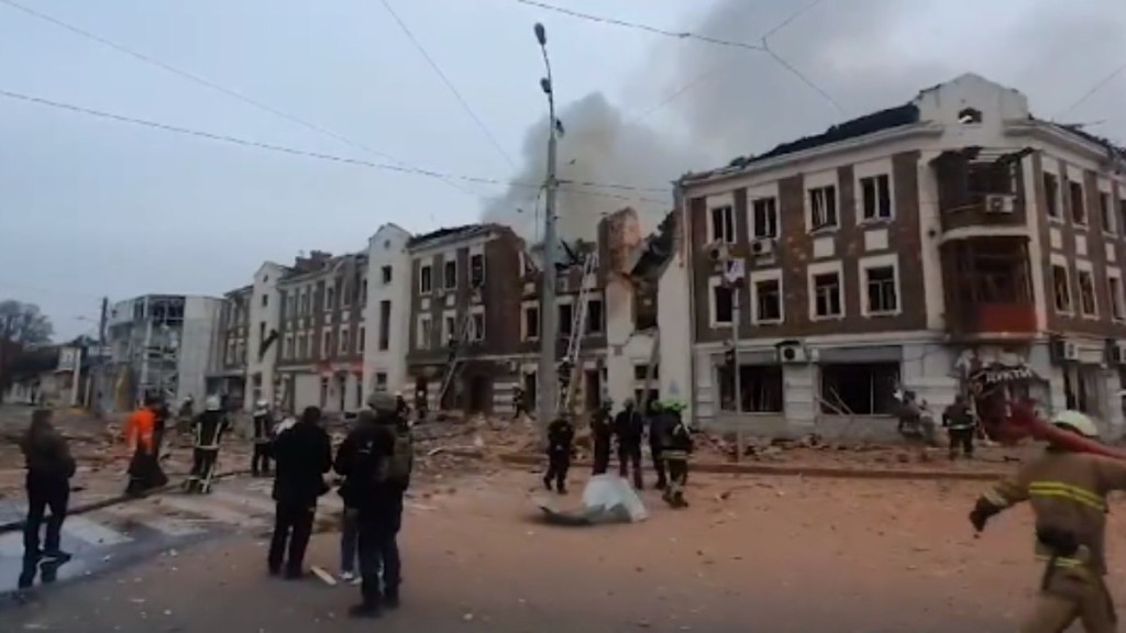 Um dos mísseis russos atingiu o bairro de Slobidsky, na zona central do município, destruindo um edifício em uma avenida rodeada de casas de civis.