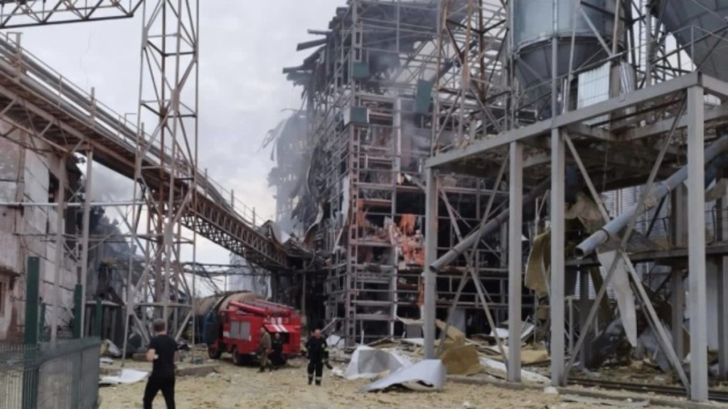 A instalação seria uma fábrica de óleo vegetal no distrito de Myrhorod, conforme o chefe de gabinete presidencial, Andriy Yermak. Nas redes sociais, ele compartilhou fotos que mostram a fábrica em chamas.