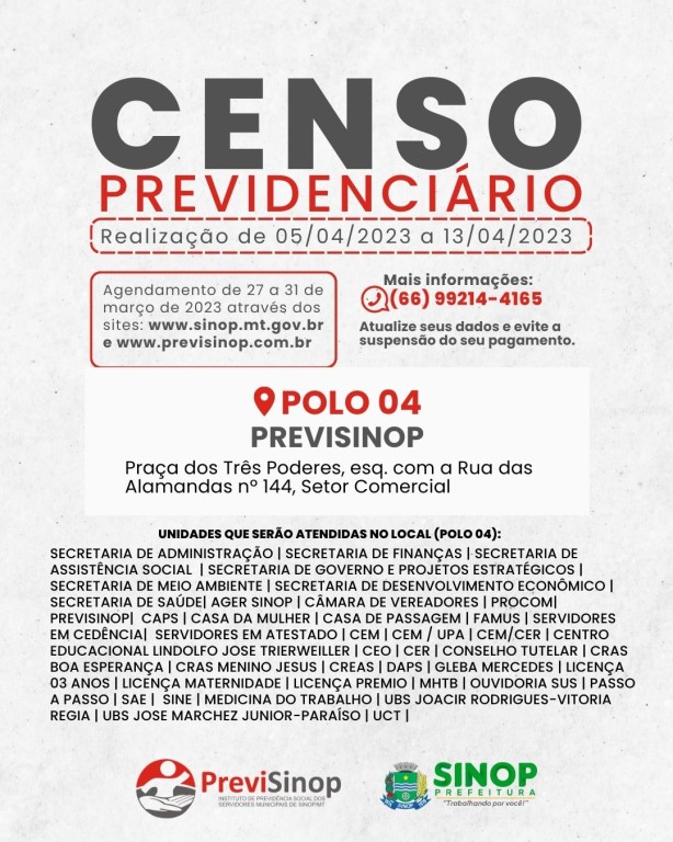 O Censo Previdenciário possui um canal exclusivo para dúvidas e informações, através do contato (66)9 9214 4165. Os agendamentos são feitos através dos sites www.previsinop.com.br e www.sinop.mt.gov.br. O recadastramento é importante para garantir o equilíbrio financeiro e atuarial do Instituto de Previdência Social dos Servidores Municipais de Sinop (PreviSinop), órgão responsável pelo pagamento das aposentadorias e benefícios dos servidores municipais de Sinop.