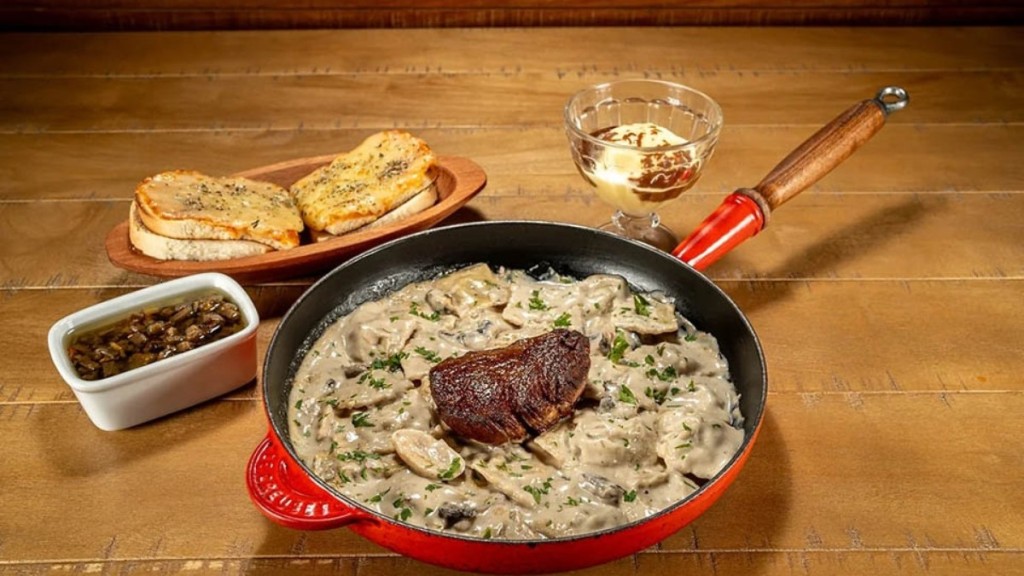 Já no jantar, a R$ 89,90 por pessoa, o menu também começa com pão italiano gratinado com queijo e orégano acompanhado com caponata, seguido por Filé mignon e panna e funghi, um dos pratos assinaturas da franquia, finalizando com uma bola de sorvete com calda de chocolate.
