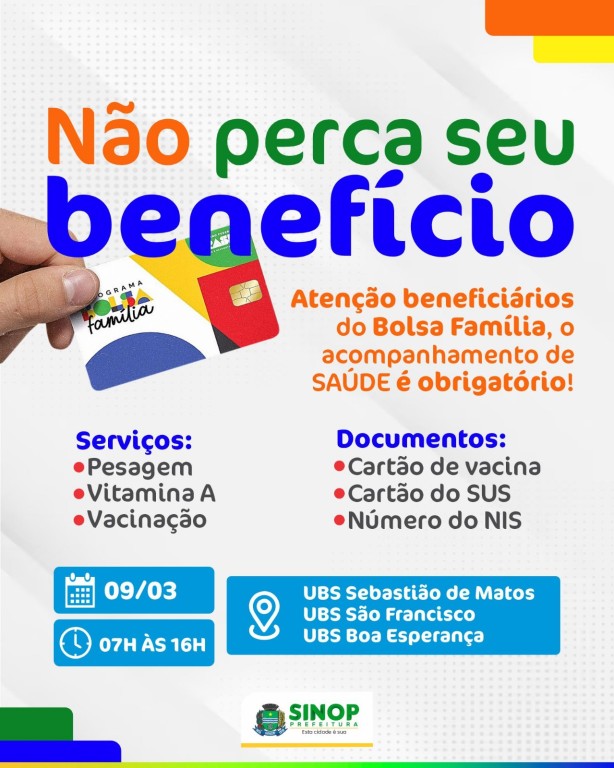 A SMS reforça que o serviço é ofertado de segunda a sexta-feira, das 7h às 11h e das 13h às 17h, em todas as Unidades Básicas de Saúde do município. A participação deste público alvo é necessária para evitar a suspensão dos benefícios.