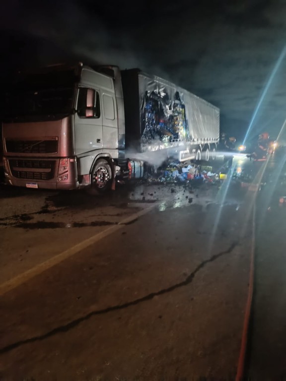 Ao chegarem ao local, os bombeiros militares constataram que o fogo destruía os pneus de tração e atingia parte da carga de bebidas transportadas pela carreta.
