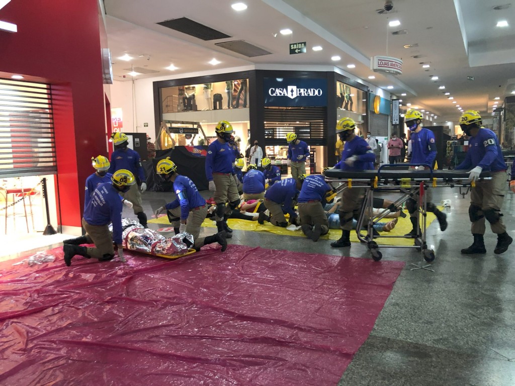 A proposta do simulado é de uma ocorrência com múltiplas vítimas, em virtude de um incêndio no shopping, seguido de uma explosão. Os alunos precisam fazer o reconhecimento da cena, avaliar as vítimas e prestar os devidos atendimentos.