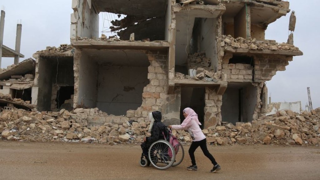 Garota ajuda sua irmã no caminho de volta do colégio para casa em Idlib, norte da Síria