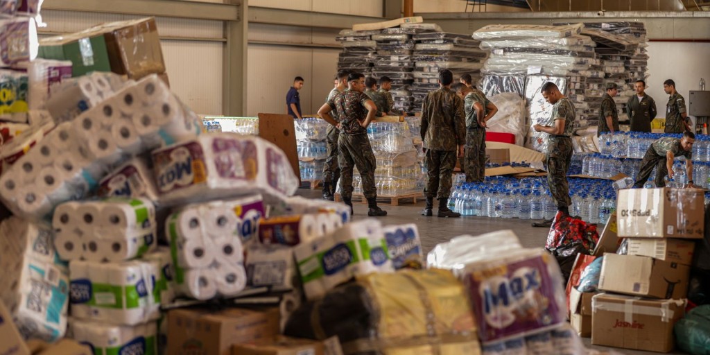 A gestante Luciana Torres abriu um espaço na agenda de empreendedora para ajudar os gaúchos. Parou o carro e, em menos de um minuto, os militares descarregaram suas contribuições. “Eu acho que, na verdade, a gente tem sempre que estar ajudando o próximo. Agora, acho que essa mobilização é essencial para que o Estado consiga se recuperar o quanto antes.”