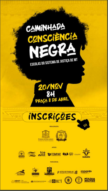 Esta matéria possui recursos de texto alternativo para promover a inclusão das pessoas com deficiência visual. Descrição das imagens: Peça publicitária colorida de amarelo, branco e preto. Foto de mulher negra com cabelo afro. Texto: Caminhada Consciência Negra – Escola do Sistema de Justiça de Mato Grosso. 20/NOV – 8h, Praça 8 de abril. Abaixo logos dos parceiros.