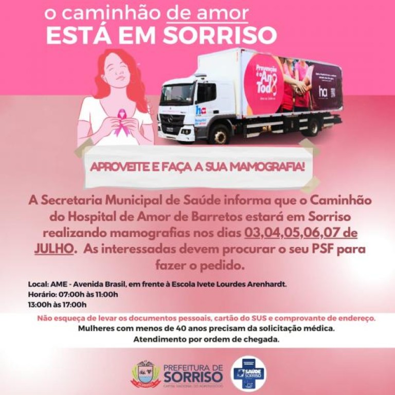 É mulher, tem 40 anos ou mais e reside em Sorriso? Então esse recadinho é para você! Na próxima semana, entre os dias 03 a 07 de julho, a unidade móvel do Hospital de Amor de Barretos estará atendendo no Município para realização de mamografias.