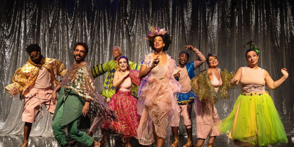 O elenco multirracial é composto por oito atores e atrizes (Paulo Verlings, Aline Carrocino, Carolina Pismel, Ester Dias, Jorge Florêncio, Nando Brandão, Patricia Elizardo e Udylê Procópio) e quatro músicos: Guilherme de Menezes (guitarrista e violonista), João Marcos Freitas (baterista), Leandro Vasques (baixista) e Raoní da Silva (percussionista).