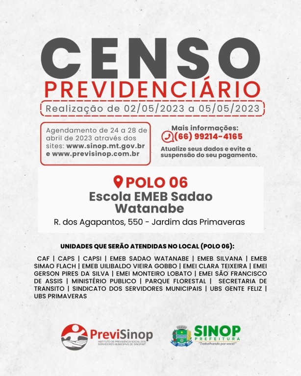 O Censo Previdenciário possui um canal exclusivo para dúvidas e informações, através do contato (66) 9 9214 4165. A atualização cadastral é importante para garantir o equilíbrio financeiro e atuarial do Instituto de Previdência Social dos Servidores Municipais de Sinop (PreviSinop), órgão responsável pelo pagamento das aposentadorias e benefícios dos servidores municipais de Sinop. Caso o segurado não compareça no período estabelecido para fazer esta atualização, terá a remuneração suspensa. Todas essas informações estão disponíveis no decreto municipal n°054/2023.