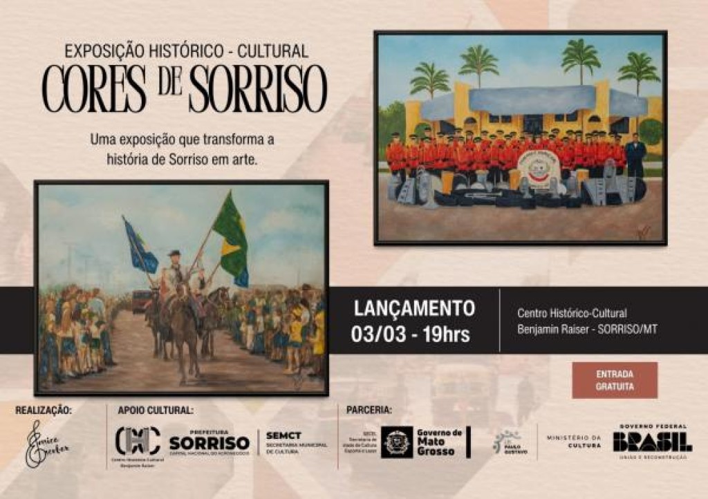 A história de Sorriso ganha novos traços, cores e significados a partir do olhar artístico da exposição “Cores de Sorriso”, que agora passa a ser realizada no Centro Histórico-Cultural Benjamin Raiser. O lançamento oficial no novo espaço acontece nesta terça-feira, dia 3 de março, às 19h, com entrada gratuita.