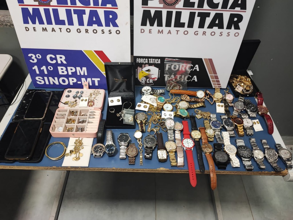 Policiais militares da 26º Companhia Independente recuperaram, na noite desta quinta-feira (04.05), R$ 700 mil em relógios e joias, que haviam sido roubados de uma residência no bairro no bairro Jardim Maringá, no município de Sinop (480 km de Cuiabá). Na ação, os militares ainda localizaram o veículo Chevrolet Tracker da vítima, prenderam cinco pessoas e apreenderam dois menores de idade.