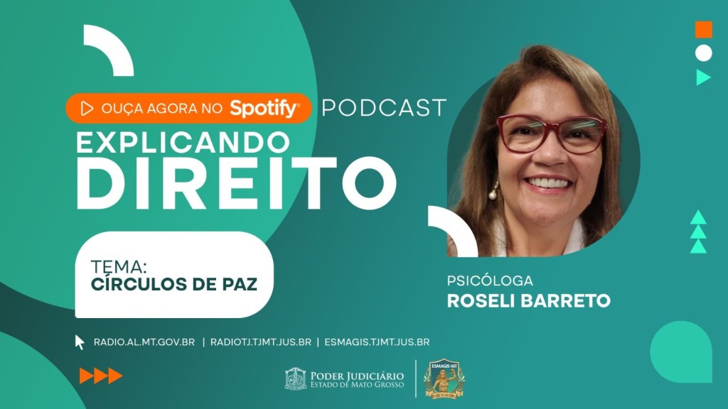 Esta matéria possui recursos de texto alternativo para promover a inclusão das pessoas com deficiência visual. Descrição: Fotografia retangular e colorida. Na lateral esquerda o texto ‘Ouça agora no Spotify!’. No canto superior direito a palavra Podcast. No centro, o nome do programa, com a foto do convidado, o tema do programa – Intimação por WhatsApp – e o nome do convidado – psicóloga Roseli Barreto. Na parte inferior os endereços eletrônicos da Rádio Assembleia, Rádio TJ e Escola da Magistratura. Assina a peça o logo do Poder Judiciário de Mato Grosso e da Esmagis-MT.