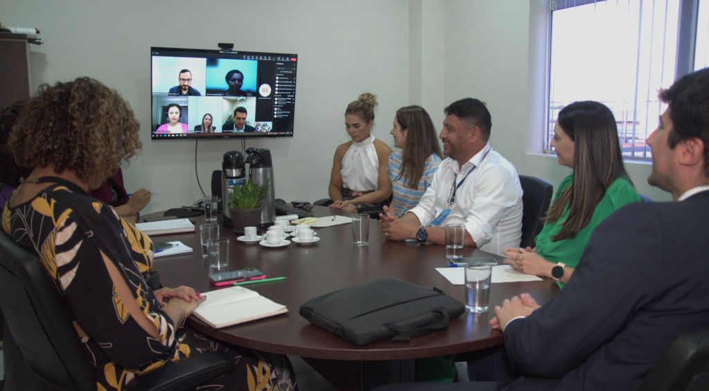 #ParaTodosVerem – Esta matéria possui recursos de texto alternativo para promover a inclusão das pessoas com deficiência visual. Descrição das imagens: Foto 01: oito pessoas sentadas à mesa de reunião que possui formato oval. No fundo da imagem há um monitor de 32 polegadas, com uma webcam e 5 pessoas participando virtualmente.