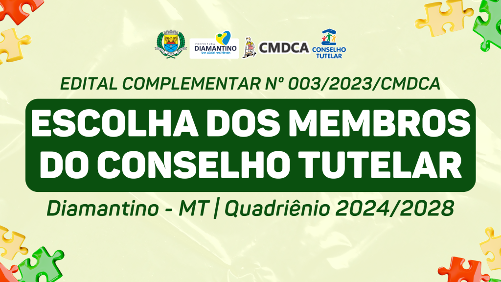 A Prefeitura de Diamantino informa que o Conselho Municipal dos Direitos da Criança e do Adolescente de Diamantino (CMDCA) prolongou o prazo de inscrição para o Processo de Escolha para membros do Conselho Tutelar. Agora as inscrições dos candidatos vão até 13 de junho de 2023, na sala dos conselhos Secretaria Municipal de Assistência Social, Trabalho e Cidadania do Município de Diamantino/MT, localizada à rua Quintino Bocaiuva n° 121 Centro.
