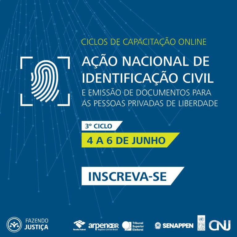 #Paratodosverem. Esta matéria possui recursos de texto alternativo para promover a inclusão das pessoas com deficiência visual. Descrição da imagem: Arte na cor predominantemente azul do Ciclo de Capacitação Online Ação Nacional de Identificação Civil e Emissão de Documentos para Pessoas Privadas de Liberdade, que traz esse nome em destaque, ao lado de um símbolo de uma digital do dedo polegar. Abaixo aparece a data do ciclo: 4 6 de junho e a palavra “Inscreva-se”. No rodapé da arte estão as logomarcas dos realizadores: Programa Fazendo Jsutiça, Receita Federal, Arpen, TSE, Senappen, PNUD e CNJ.
