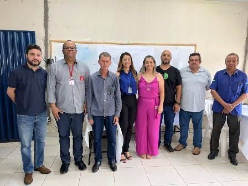 #ParaTodosVerem – Esta matéria possui recursos de texto alternativo para promover a inclusão das pessoas com deficiência visual. Descrição da imagem. Foto 1 – O juiz de direito da Vara Única da Comarca de Pedra Preta, Márcio Rogério Martins, e demais parceiros do dia D da Regularização Fundiária. Eles estão em pé, em uma sala de aula, posando para a foto. Ao fundo um quadro branco.