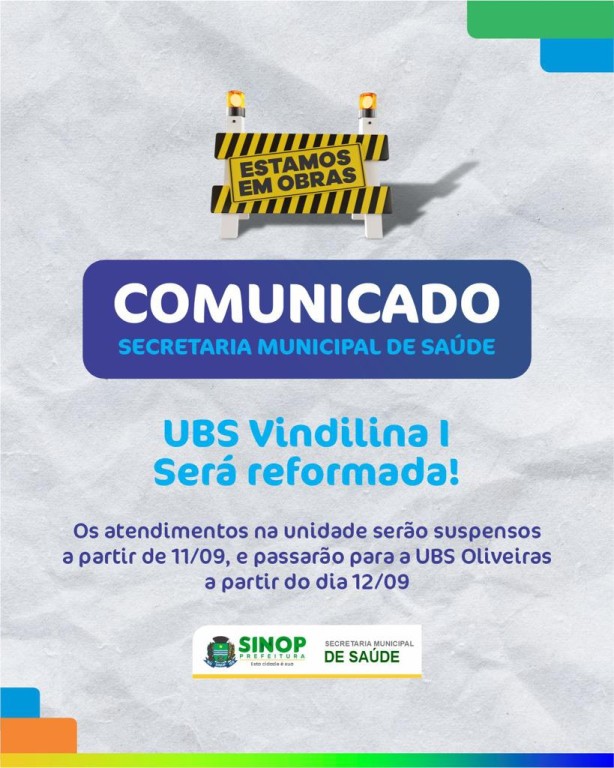 A Prefeitura de Sinop segue com o cronograma de reformas das Unidades Básicas de Saúde do município. A Secretaria Municipal de Saúde (SMS) comunica que, a partir desta segunda-feira (11) a Unidade Básica de Saúde do Maria Vindilina I, estará fechada para obras. Os atendimentos aos usuários serão realizados na UBS Oliveiras, a partir de terça-feira (12) sem afetar os trabalhos desenvolvidos.