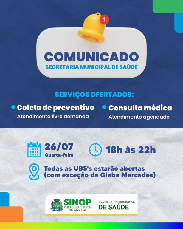 A Secretaria de Saúde informa que nesta quarta-feira (26), as UBS’s terão horário de atendimento estendido. Serão ofertados coleta de preventivo (papanicolau), com atendimento livre demanda, e consulta médica com agendamento, das 18h às 22h.