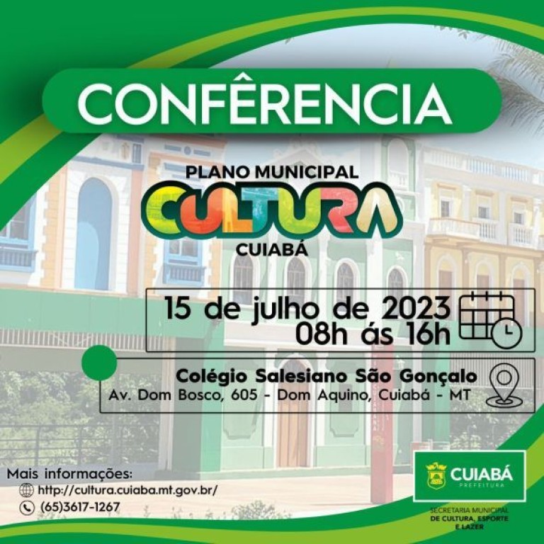 Será realizada nesse sábado (15), a Conferência Municipal do Plano Municipal de Cultura, no colégio Salesiano São Gonçalo, a partir das 8h. Artistas, produtores culturais, gestores de entidades, espaços culturais e sociedade civil em geral estão convidados para contribuírem na elaboração e aprovação do texto final do Plano Municipal de Cultura. Durante o encontro serão analisadas as propostas onde todos os participantes terão direito a voz e voto.