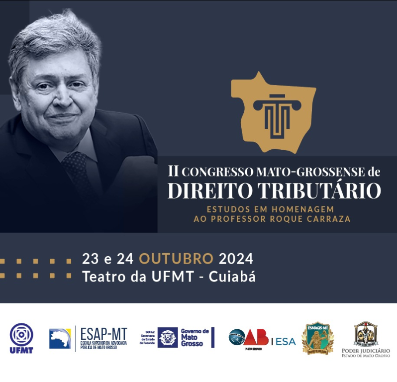 Continuam abertas as inscrições para o “II Congresso Mato-Grossense de Direito Tributário – edição em homenagem a Roque Carrazza”, que será realizado nos dias 23 e 24 de outubro, das 8h às 12h e das 14h às 18h, no Teatro da Universidade Federal de Mato Grosso, em Cuiabá. A Escola Superior da Magistratura de Mato Grosso (Esmagis-MT) é uma das organizadoras do evento.