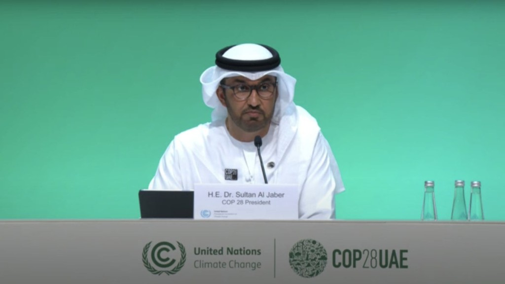 Segundo al-Jaber em uma conversa informal, “nenhum estudo científico, nenhum cenário, diz que a saída dos combustíveis fósseis nos permitirá atingir 1,5°C”. Na coletiva, ele reiterou a ” redução e a saída dos combustíveis fósseis são inevitáveis”.