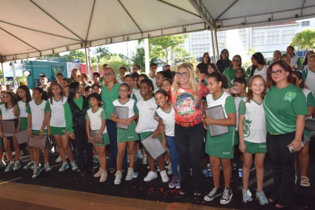 A primeira-dama de Cuiabá, Márcia Pinheiro, acompanhou, na tarde desta terça-feira (12), na Praça Alencastro, a apresentação especial de encerramento das atividades do ano letivo de 2023 do Coral Infantojuvenil ‘Canto da Gurizada’.