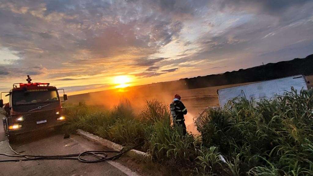 A equipe da 11ª Companhia Independente Bombeiro Militar (11ª CIBM) foi acionada por volta das 5h para atender à ocorrência. Segundo relato do condutor, ele tentou desviar de uma carreta, quando o veículo saiu da pista. Em seguida, as chamas tiveram início.