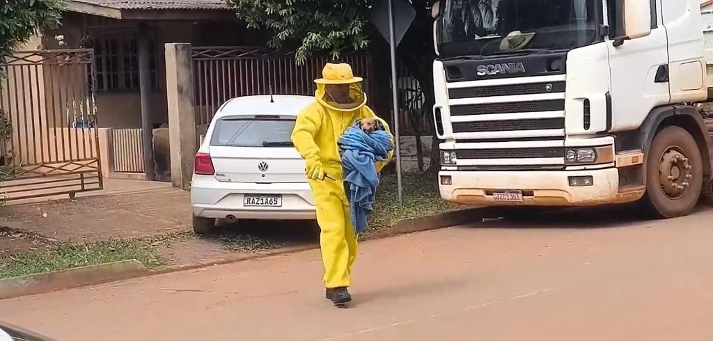 A equipe do 4º Batalhão Bombeiro Militar (4º BBBM) foi acionada, por volta das 09h20, pela proprietária da residência, que relatou que as abelhas haviam atacado seus animais domésticos, sendo dois cachorros e um papagaio.