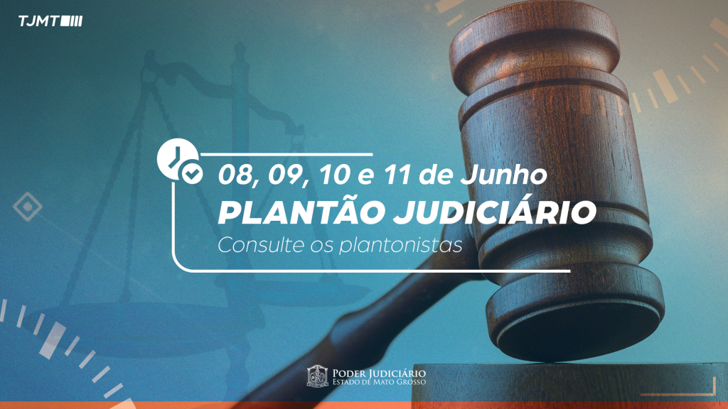 Fotografia colorida. Ao fundo a sombra da balança da justiça e um malhete de madeira. Acompanha o texto: 08, 09, 10 e 11 de Junho – Plantão Judiciário | Consulte os plantonistas. Assina a peça o logo do Poder Judiciário do Estado de Mato Grosso.