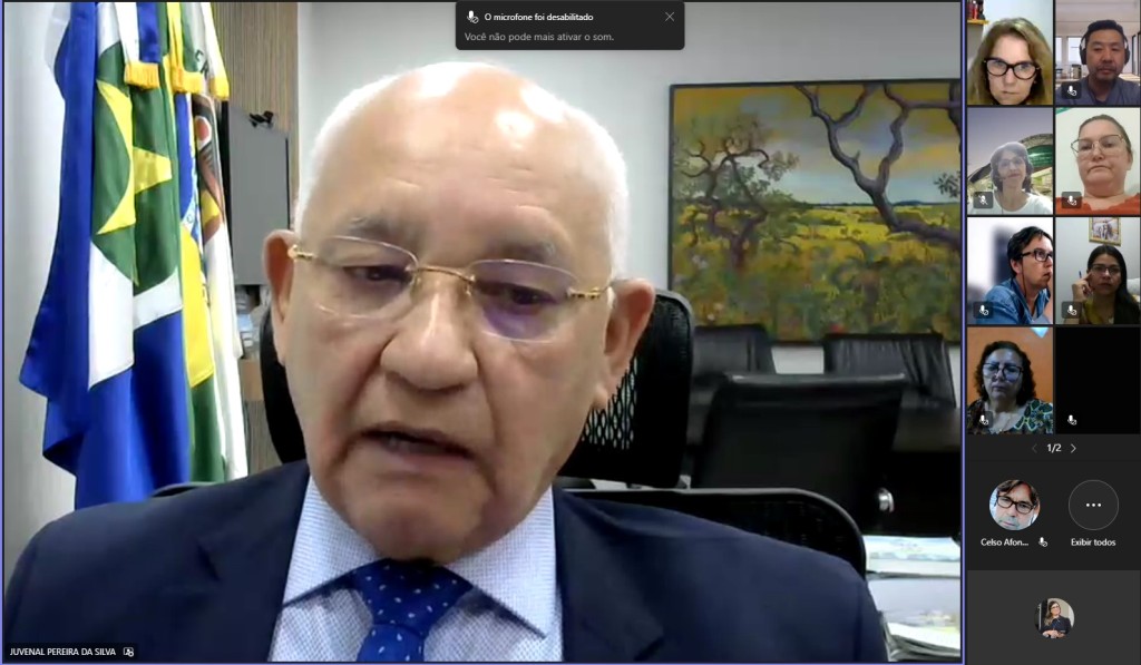#Paratodosverem. Esta matéria possui recursos de texto alternativo para promover a inclusão das pessoas com deficiência visual. Primeira imagem: Print de tela da reunião no momento em que o corregedor faz a abertura do curso. Ele está usando um terno azul marinho.