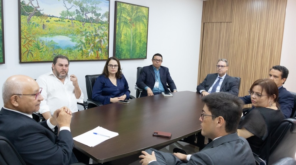 #ParaTodosVerem. Esta matéria possui recursos de texto alternativo para promover a inclusão das pessoas com deficiência visual. Foto 1: Imagem colorida. Todos estão sentados à mesa. O corregedor está de costa e veste terno preto e camisa branca. A sua direita está o procurador-geral.
