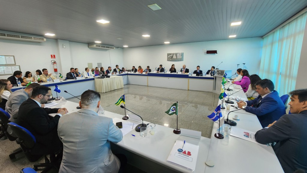 #ParaTodosVerem. Esta matéria possui recursos de texto alternativo para promover a inclusão das pessoas com deficiência visual. Foto 1: Imagem colorida. Todos os participantes estão sentados no plenário. Ao centro, em frente a logo da OAB/MT, está a presidente da OAB e a sua direita o corregedor. Foto 2: Imagem colorida. Todos os participantes da reunião estão perfilado em pé para a foto.